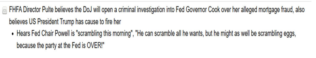 The situation has escalated beyond Trump’s tweets. Treasury Secretary Bessent has reiterated calls for lower interest rates, and even the FHA chairman recently joined the fray with comments Calling for lower interest rates and attacking Powell. Meanwhile, there have been Trump’s call for Fed Governor Lisa Cook to resign over an alleged mortgage scandal, whether true or not, critics argue it reflects an effort to shape a more dovish Fed board.